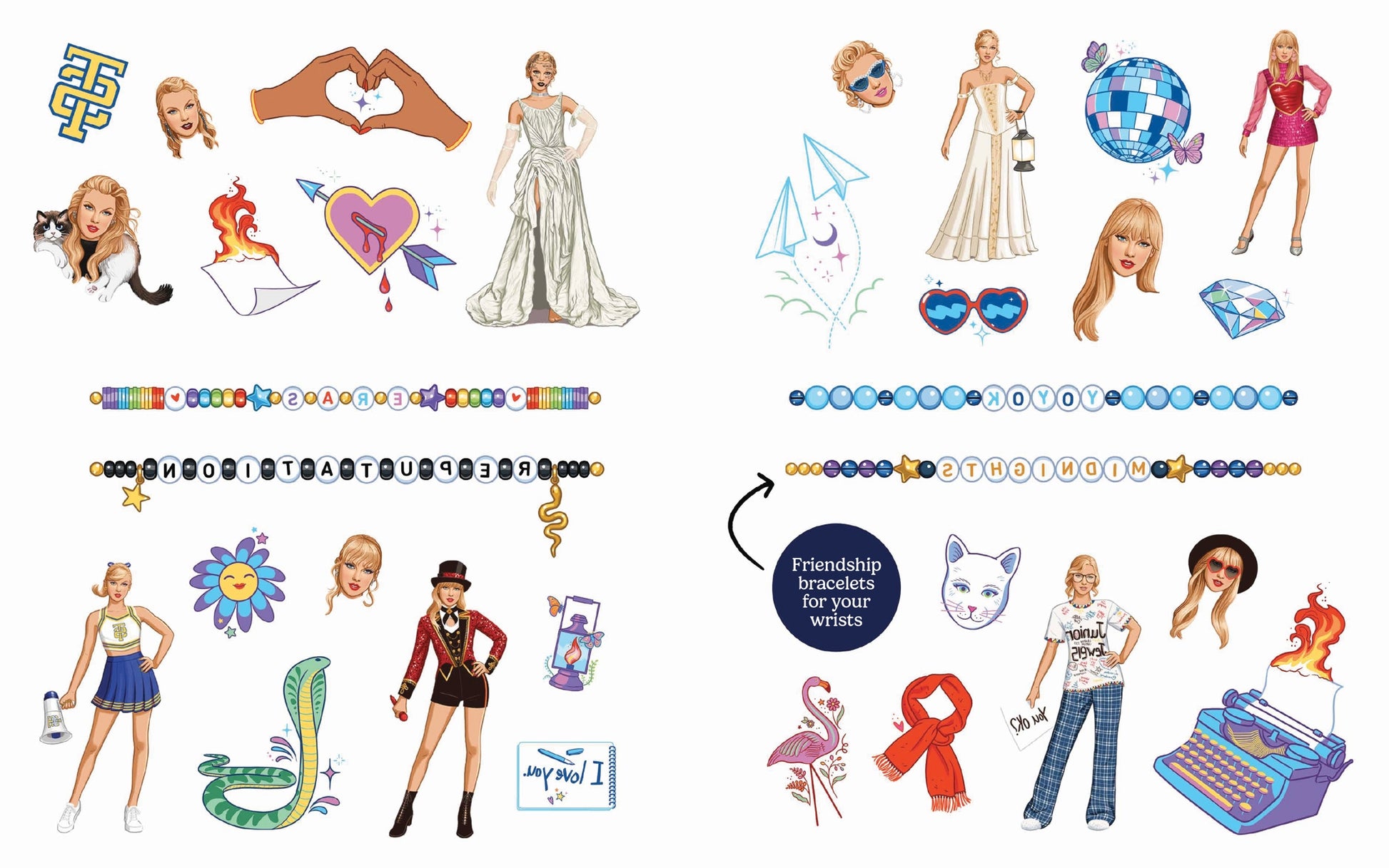 Choose from more than 60 illustrations, including multiple Taylors, friendship bracelets, cats, flowers, butterflies, and typographical tatts, each one equally perfect as a stand-alone tat or as part of a larger mix-and-match artwork.