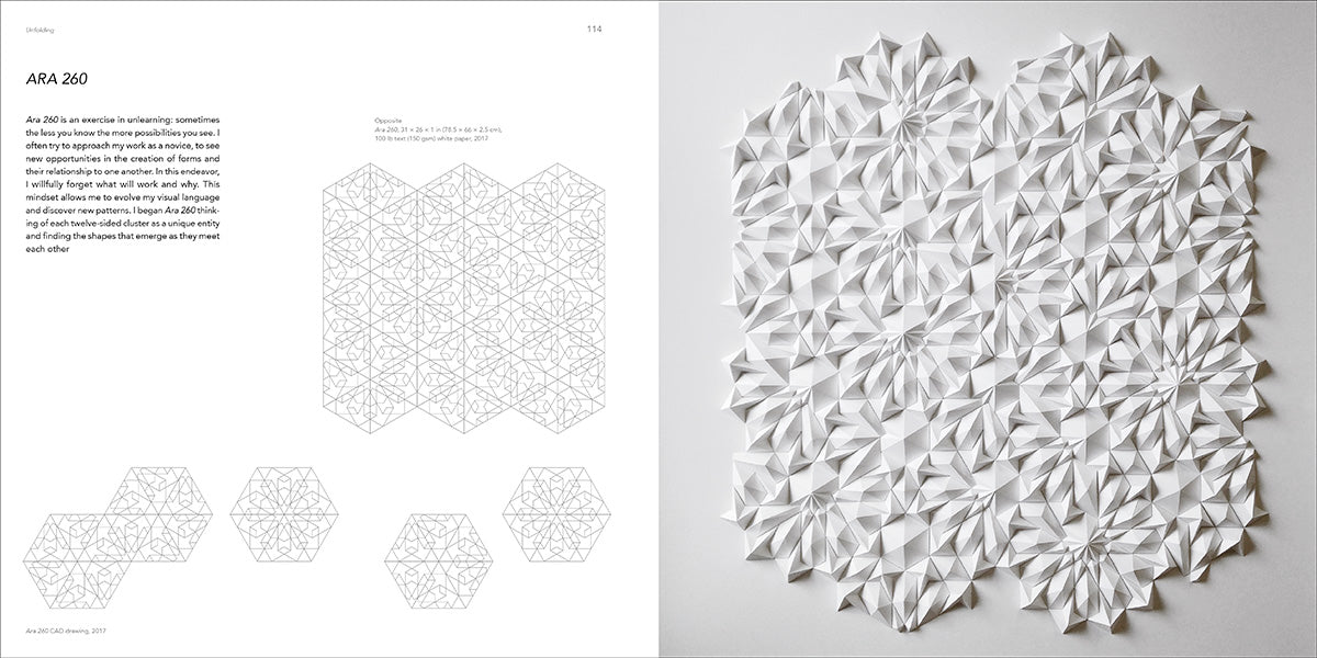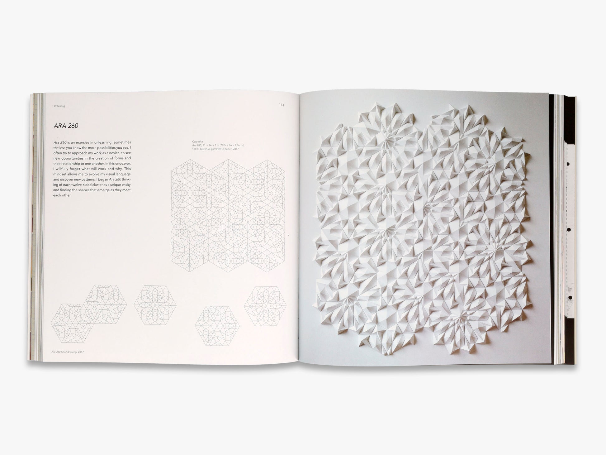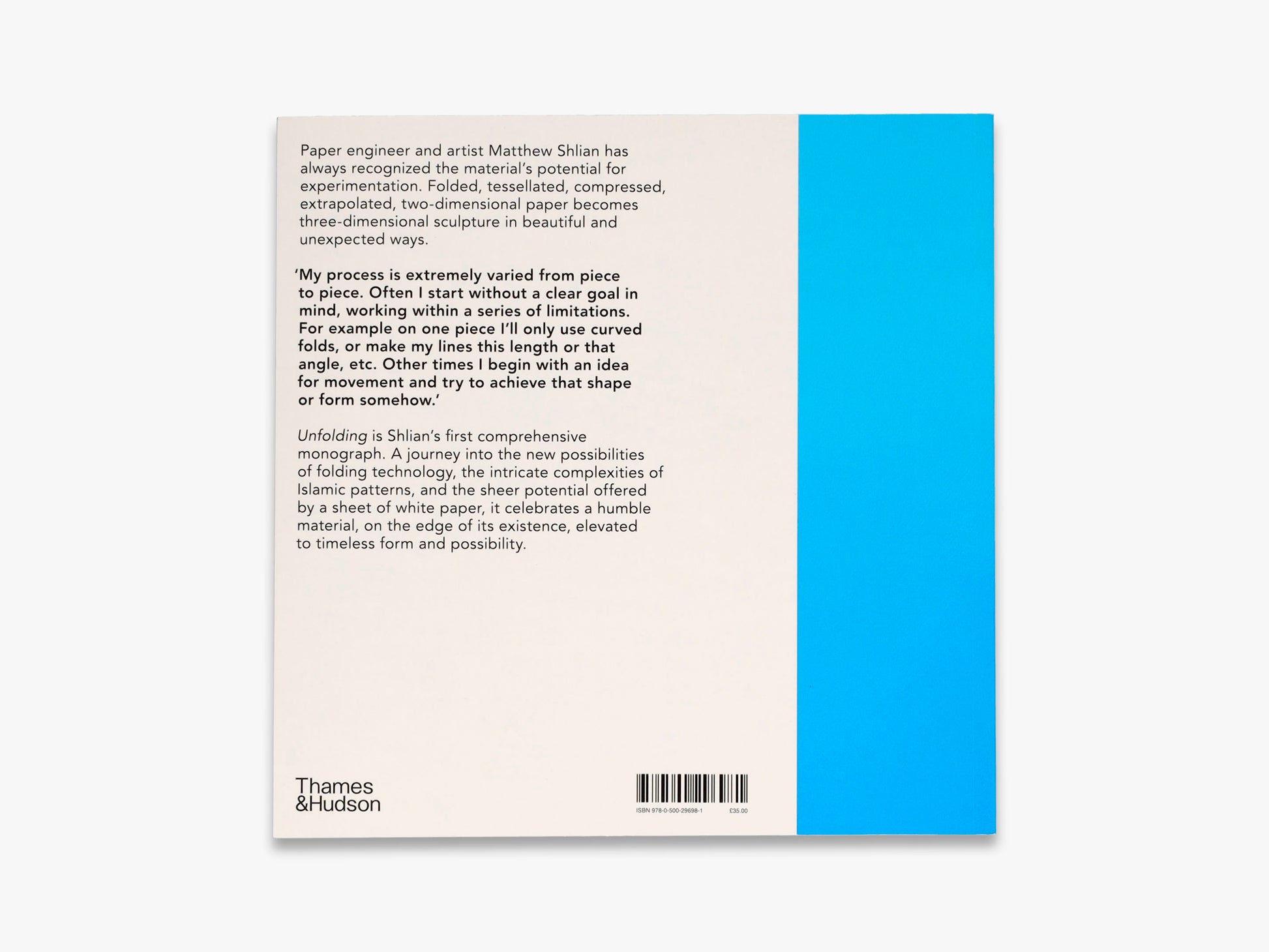 Unfolding is Shlian's first comprehensive monograph. A journey into the new possibilities of folding technology, the intricate complexities of Islamic patterns, and the sheer potential offered by a sheet of white paper, it celebrates a humble material, on the edge of its existence, elevated to timeless form and possibility.