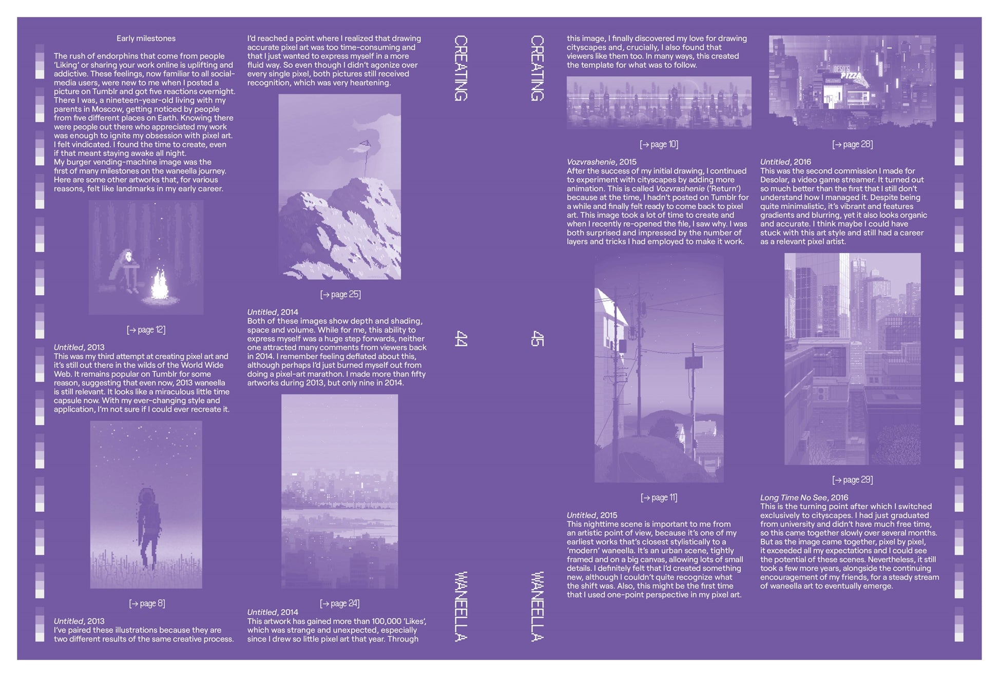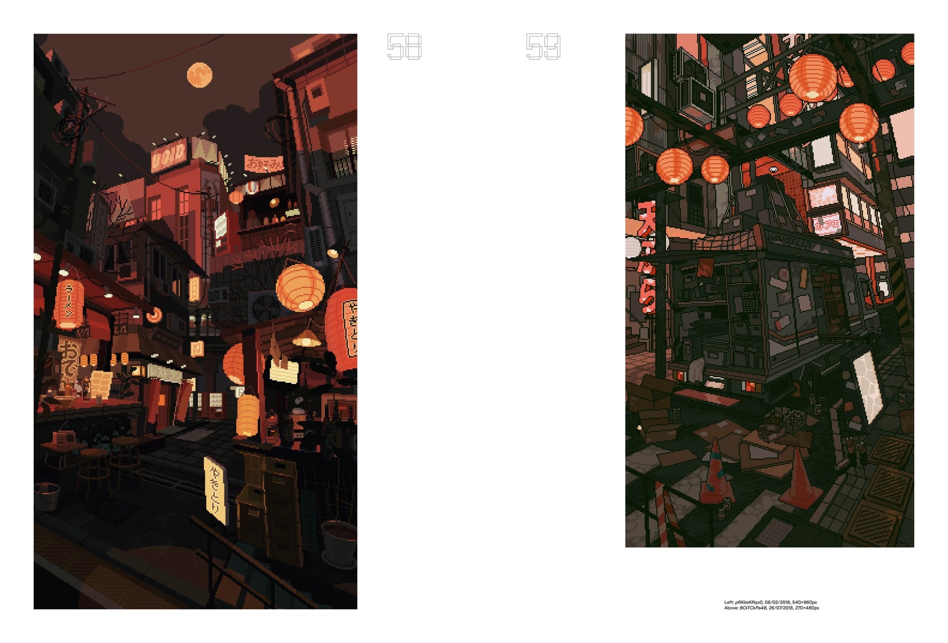 Alongside this complete catalogue of Waneella's works are several 'Process' sections, walking the reader through Waneella's working style, which often initially draws influence from Japanese streets found via Google Streetview. Her creative process is explored step by step, detailing the underlying structure, rigorous perspective work and experimentation that goes into every piece. Each step is accompanied by open and often very funny commentary from the artist herself - some of these 'how tos' span over twenty steps, making Pixelscapes a must-have for Waneella's legions of budding pixel artist followers.