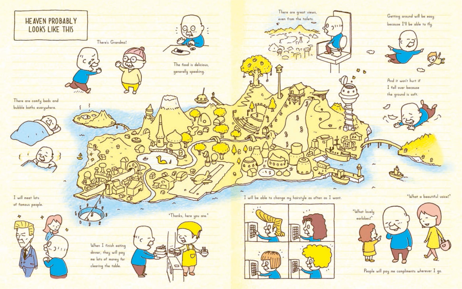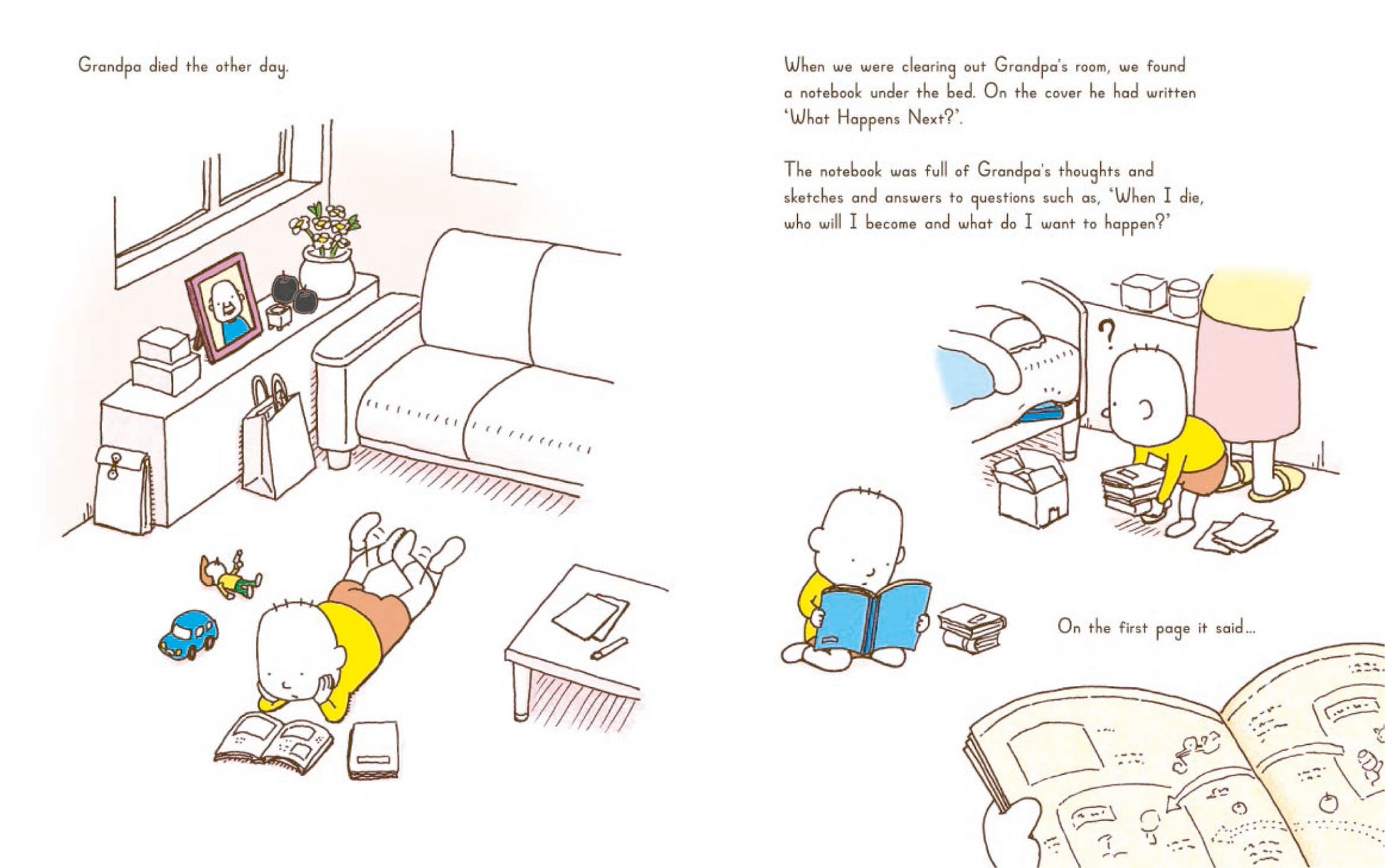 What Happens Next? follows a child's hilarious, wildly inventive train of thought following the death of his grandfather and the discovery of his journal, in which his grandfather had jotted his thoughts about life after death and the ideal heaven.