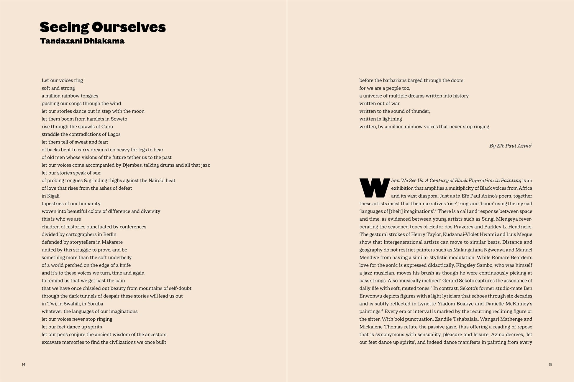 With a primary focus on representational painting, When We See Us celebrates how artists from Africa and the African diaspora have imagined, positioned, memorialized and asserted African and African diasporic experiences during a 100-year period spanning from the early 20th century to the present. The publication demonstrates how generations of artists throughout the 20th century and at the beginning of the 21st have critically engaged with multiple notions of Blackness and Africanity.
