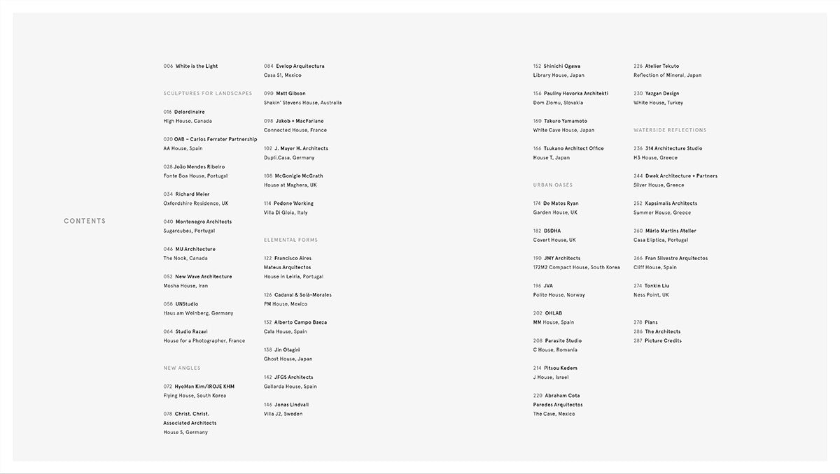This survey presents the most striking, innovative and unusual white houses by contemporary architects spanning the globe from Asia to the Americas, showcasing inspirational residential projects by established and emerging talents, including Aires Mateus, Jakob + Macfarlane, Jürgen Mayer and Shinichi Ogawa. From radical new takes on traditional building forms in Latin America to state-of-the-art urban projects in Europe and Japan, each featured house employs the apparent simplicity of white to reflect light and accent materiality, pressing the frontiers of form to the point of abstraction.