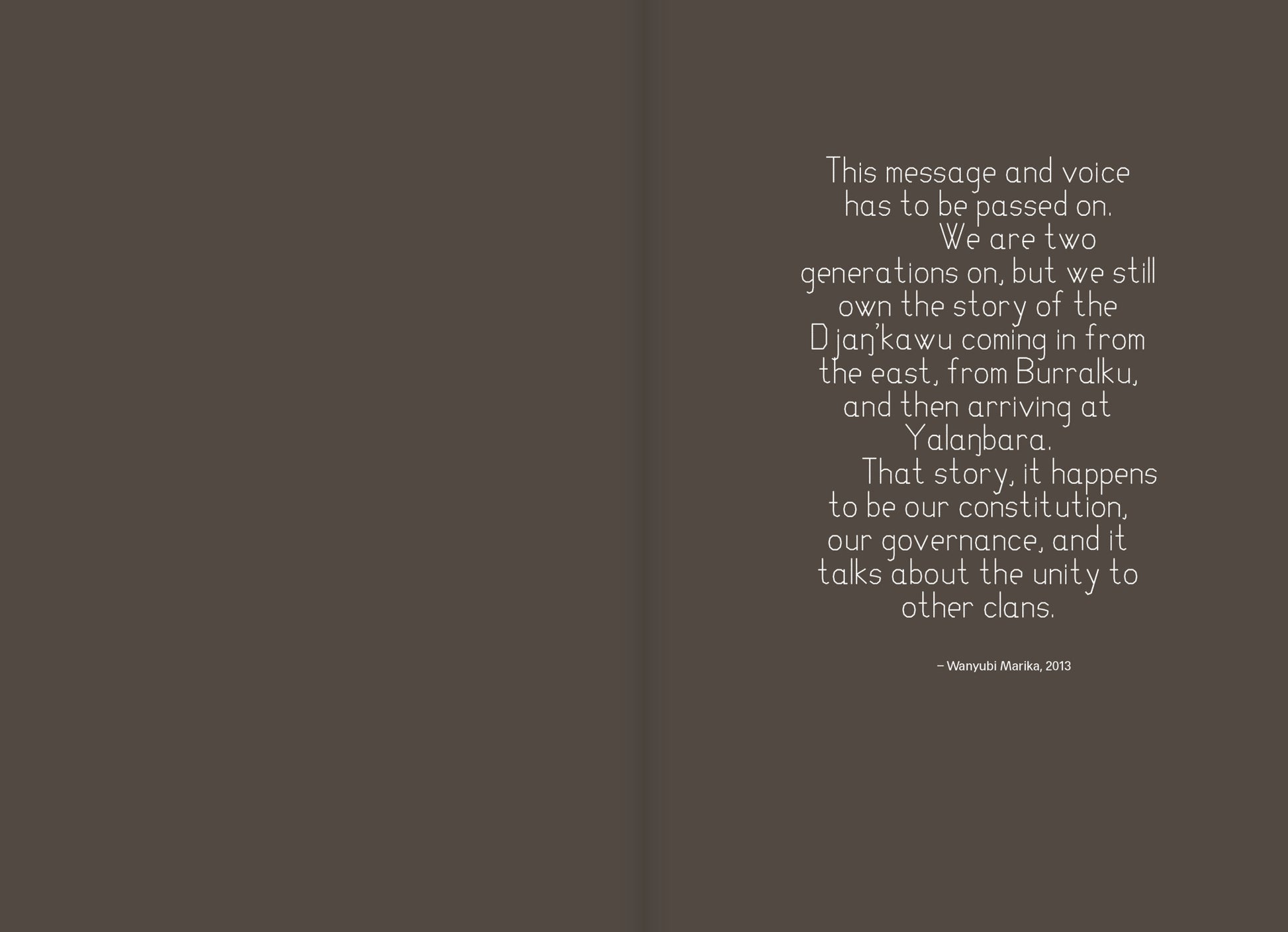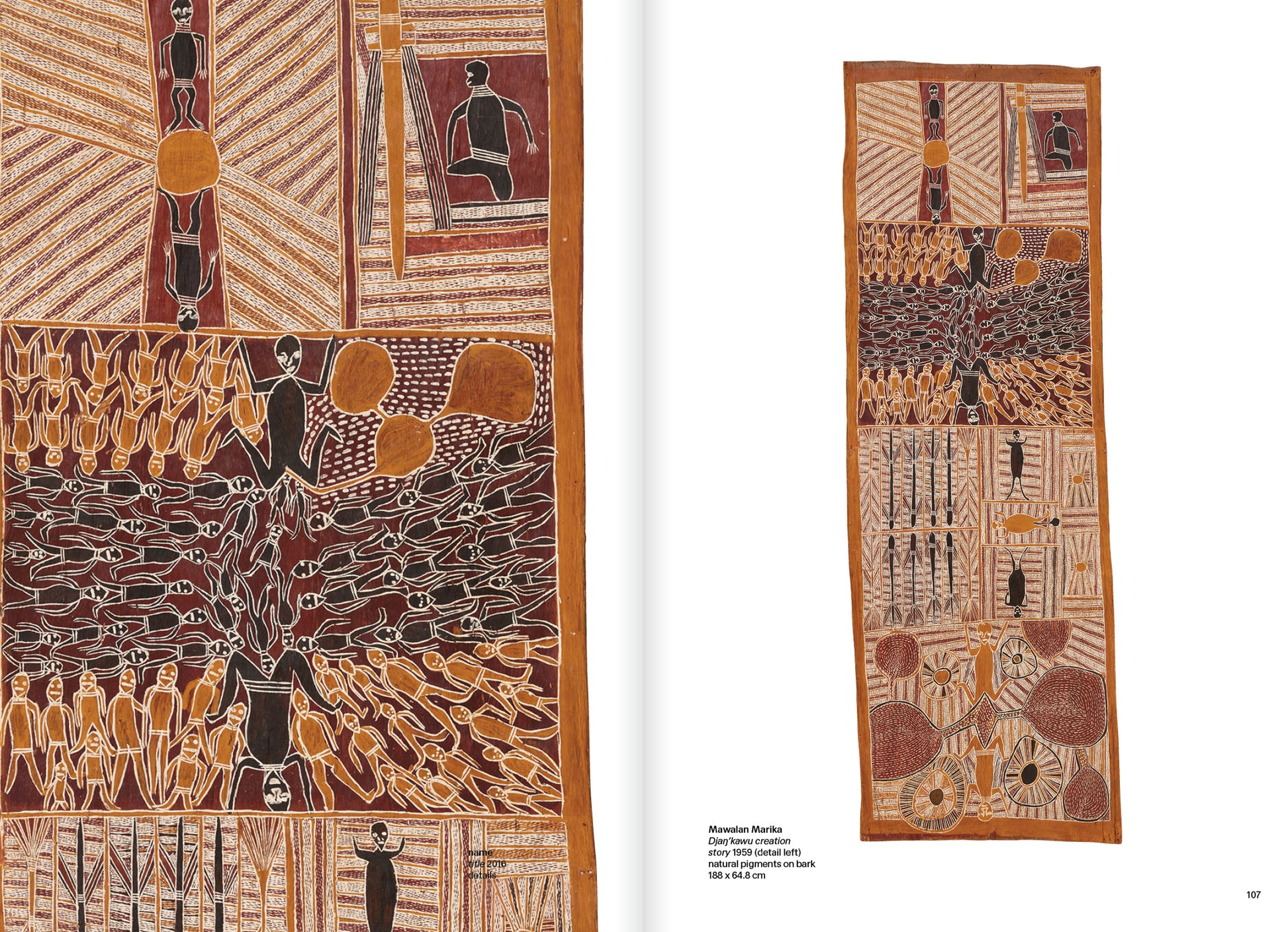 An essay by the exhibition curator, Cara Pinchbeck, provides an overview of the various innovative art practices in Yirrkala, examiningthe influence of inheritance, family connections, and acts of diplomacy and activism. Ma?arrpa leader and artist DjambawaMariwili discusses the nuances of speaking for Country (land, sea and sky) with the Aboriginal arts specialist Kade McDonald, and the coordinator at Buku-Larr?gay Mulka Centre in Yirrkala, Will Stubbs, writes on the power embodied in Yol?u art.